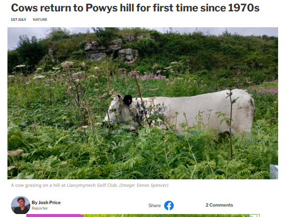 In this instance, the Powys County Times reported that two of Helen’s cattle are grazing a large hill near Llanymynech Golf Club in order to benefit rare butterflies. By browsing and trampling the area, the scrub and trees that had been taking over will be thinned and conditions will be more suitable for butterflies such as the Grizzled Skipper (Pyrgus malvae) and Dingy Skipper (Erynnis tages). You can read the article here: https://www.countytimes.co.uk/news/25281727.cows-return-powys-hill-first-time-since-1970s/