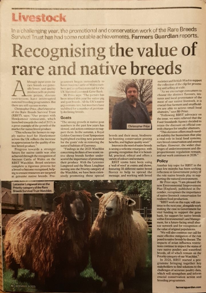 Ymddangosodd Gwartheg Hynafol Cymru yn rhifyn Nadolig y Farmers Guardian am yr eildro yn 2025. Mewn adolygiad o’r flwyddyn, tynnodd Prif Weithredwr yr Ymddiriedolaeth Goroesi Bridiau Prin (RBST), Christopher Price, sylw at nifer o lwyddiannau’r sefydliad gan gynnwys cydnabod Gwartheg Hynafol Cymru ar Restr Wylio (Watchlist) RBST a dechrau rhaglenni i gynyddu niferoedd anifeiliaid GHC a chasglu deunydd ar gyfer Banc Genynnau Da Byw Cenedlaethol y DU.